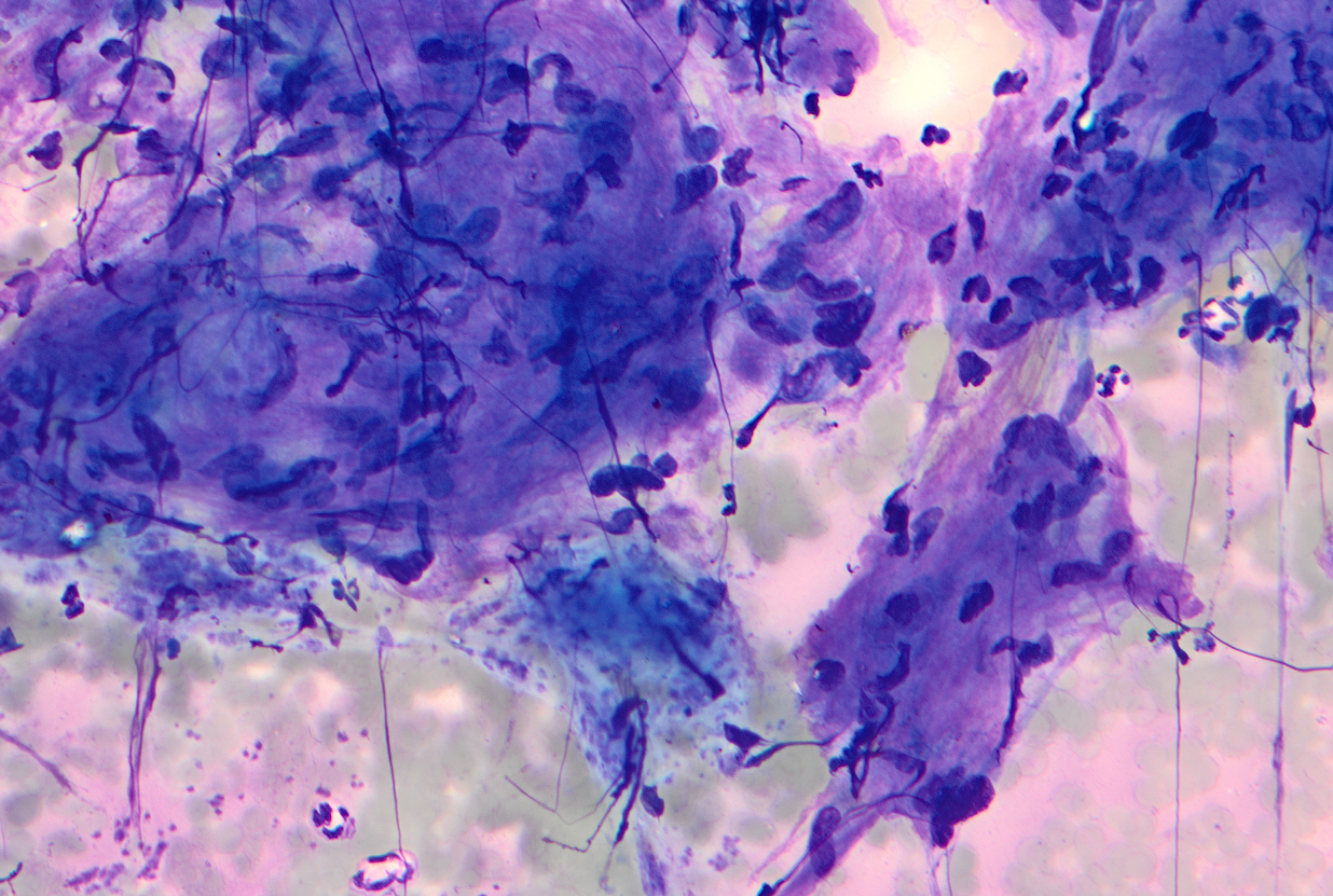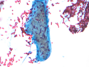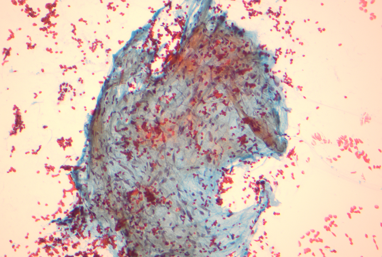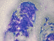 Figure 1: EBUS FNA of hilar mass, aspirate smear, Diff-Quik stained