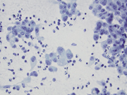 - Figure 2: Transbronchial FNA of left lower lobe lung nodule, aspirate smear, Pap stained, 20× magnification.