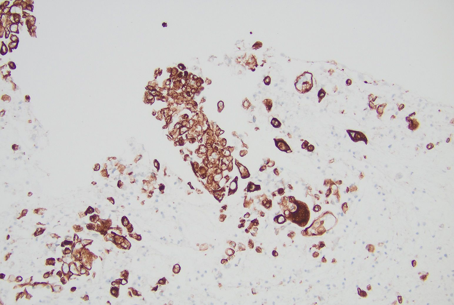 - Figure 4: Cell block, AE1/3 immunohistochemical stain, 10× magnification.